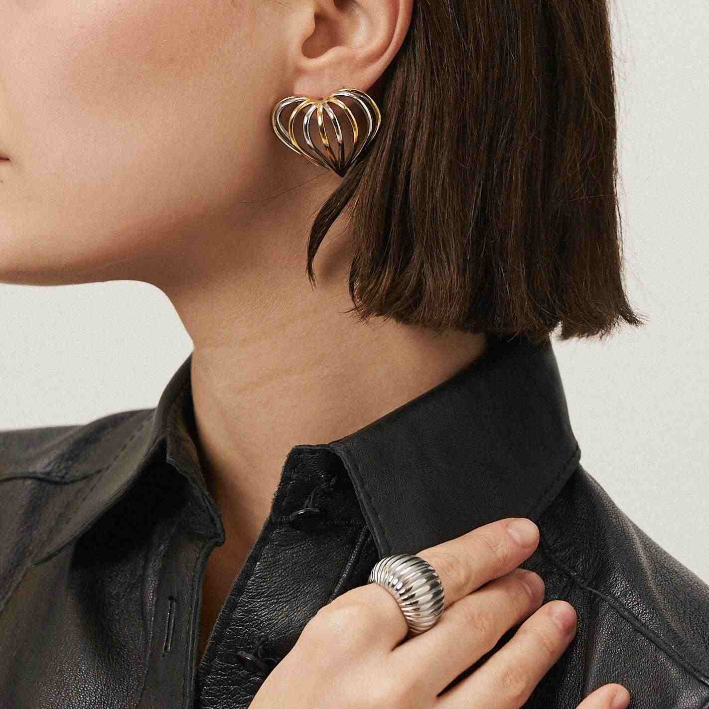 The heart in a cage shape is a symbol of love and protection. A blend of gold and silver plating which gives them a luxurious touch. Ideal for those who love making a statement with their accessories. Designed for lasting comfort with attention to detail. Elevate your look with this captivating design that celebrates the strength and beauty of love.