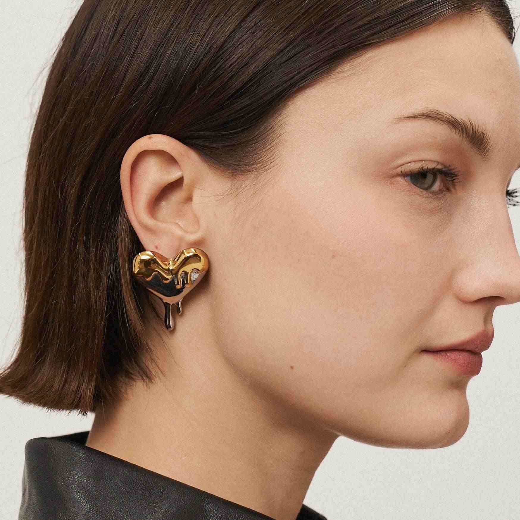 A fusion of gold and silver, the Melt My Heart Earrings feature a striking silver heart stud with molten gold cascading over it, creating a unique piece that embodies contrast and elegance. Designed for those who value bold jewelry, these gold plated heart stud earrings blend gold with silver accessories.